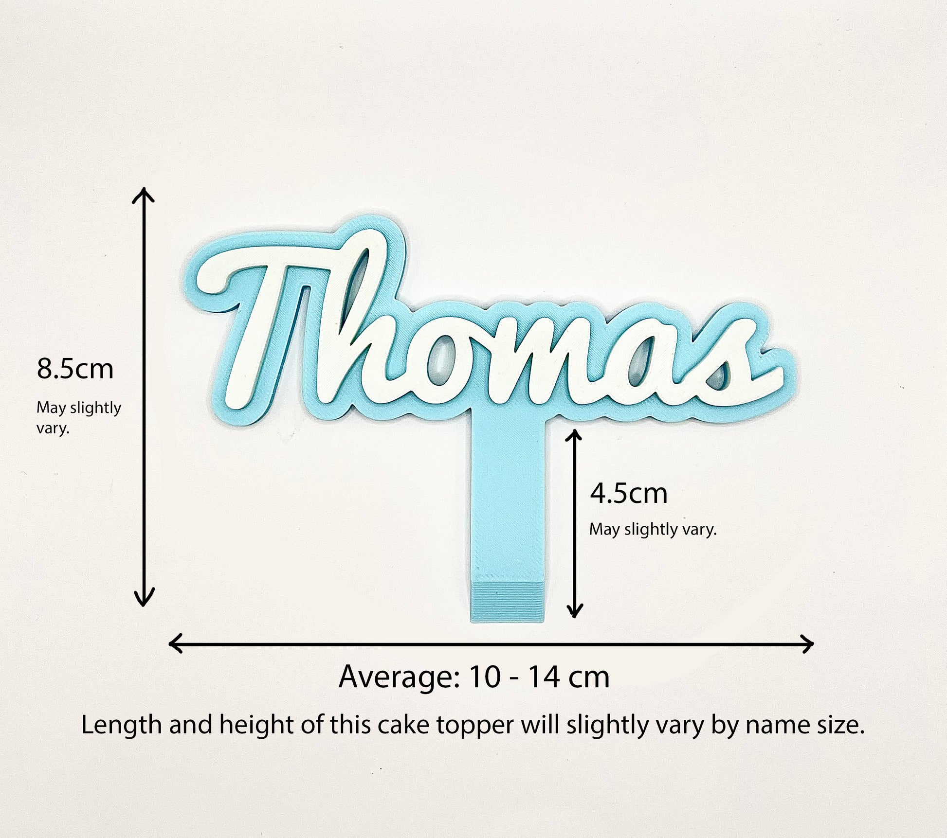 - Sizes will vary depending on name length. The average length of this cake topper for a name between 5-7 characters long is approx. 10-13cm (May vary)